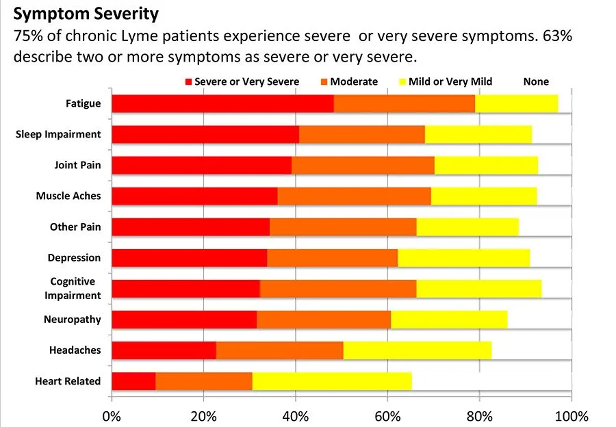 In LDo’s chronic Lyme disease survey, over 75% of patients reported at least one symptom as severe or very severe and 63% reported two or more such symptoms. (Johnson 2014) Find out more about LDo peer-reviewed published surveys. The chart below shows the severity of ten common chronic Lyme symptoms.